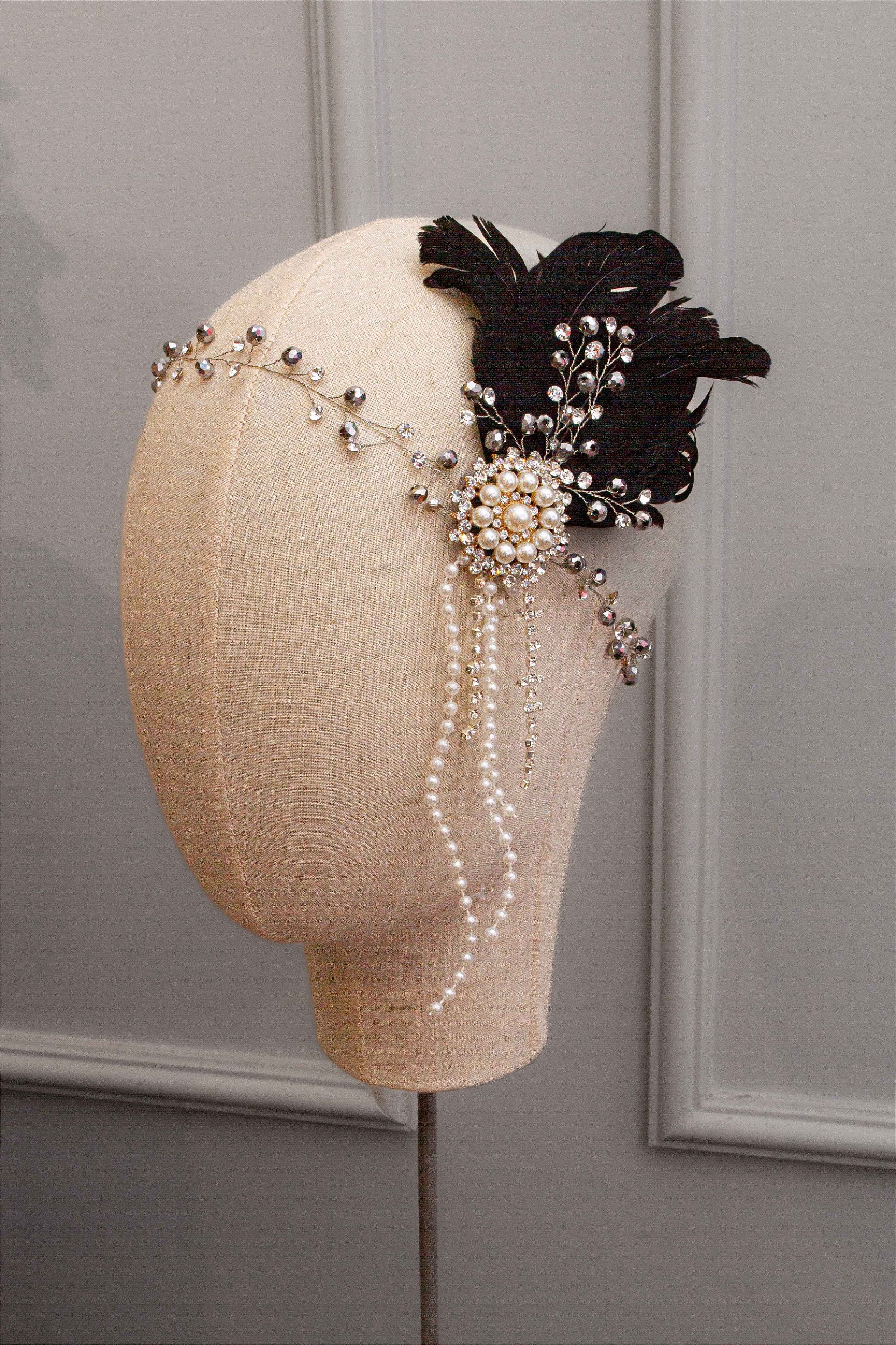 Adorno de cabeça com penas, cristais e pérolas