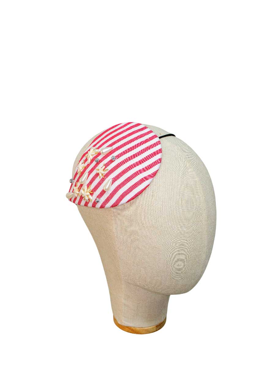 O JC Casquete Navy é uma peça de alta chapelaria que traduz elegância contemporânea com delicadeza artesanal. Confeccionado em base listrada navy, recebe aplicação manual de flores e pérolas, criando um contraste sutil entre grafismo e poesia.