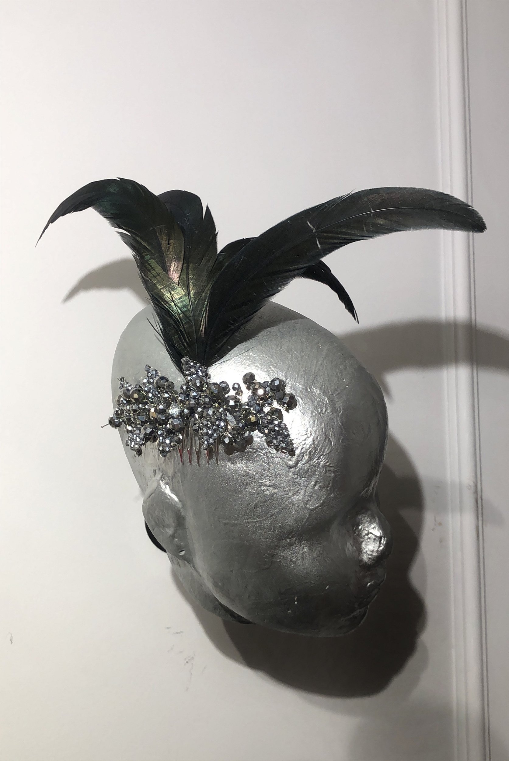 A JC Luz combina penas alongadas em composição vertical com um núcleo de cristais aplicados à mão, criando contraste entre opacidade e reflexo. A peça desenha o perfil com força gráfica e elegância precisa.