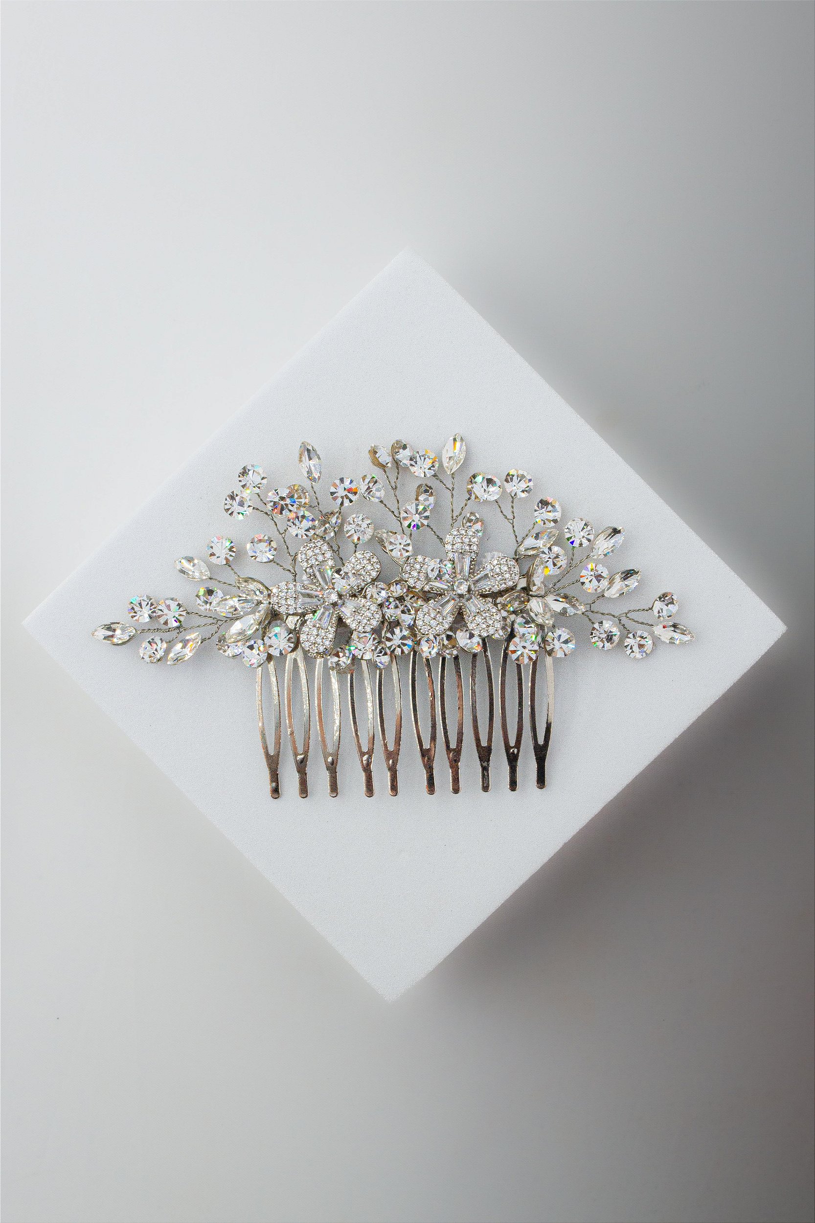 Inteiramente feita à mão, é um acessório que alia a tradição da chapelaria ao luxo da joalheria artesanal, criando um adorno sofisticado e versátil. Sua estrutura em pente garante fixação confortável e segura em diferentes estilos de penteado, desde coques clássicos até ondas soltas.