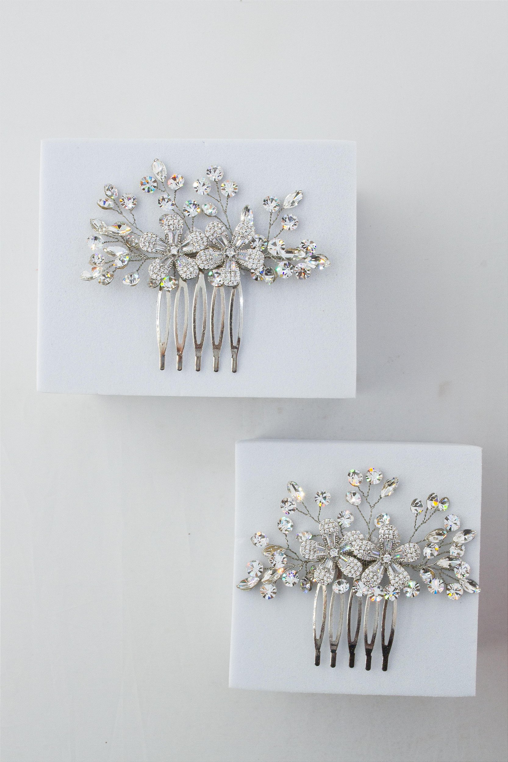 Flores delicadamente modeladas em cristais lapidados e ramos que captam cada feixe de luz formam um conjunto sofisticado, que pode ser usado em pares simétricos ou em arranjos assimétricos, valorizando ainda mais a personalidade de cada noiva.