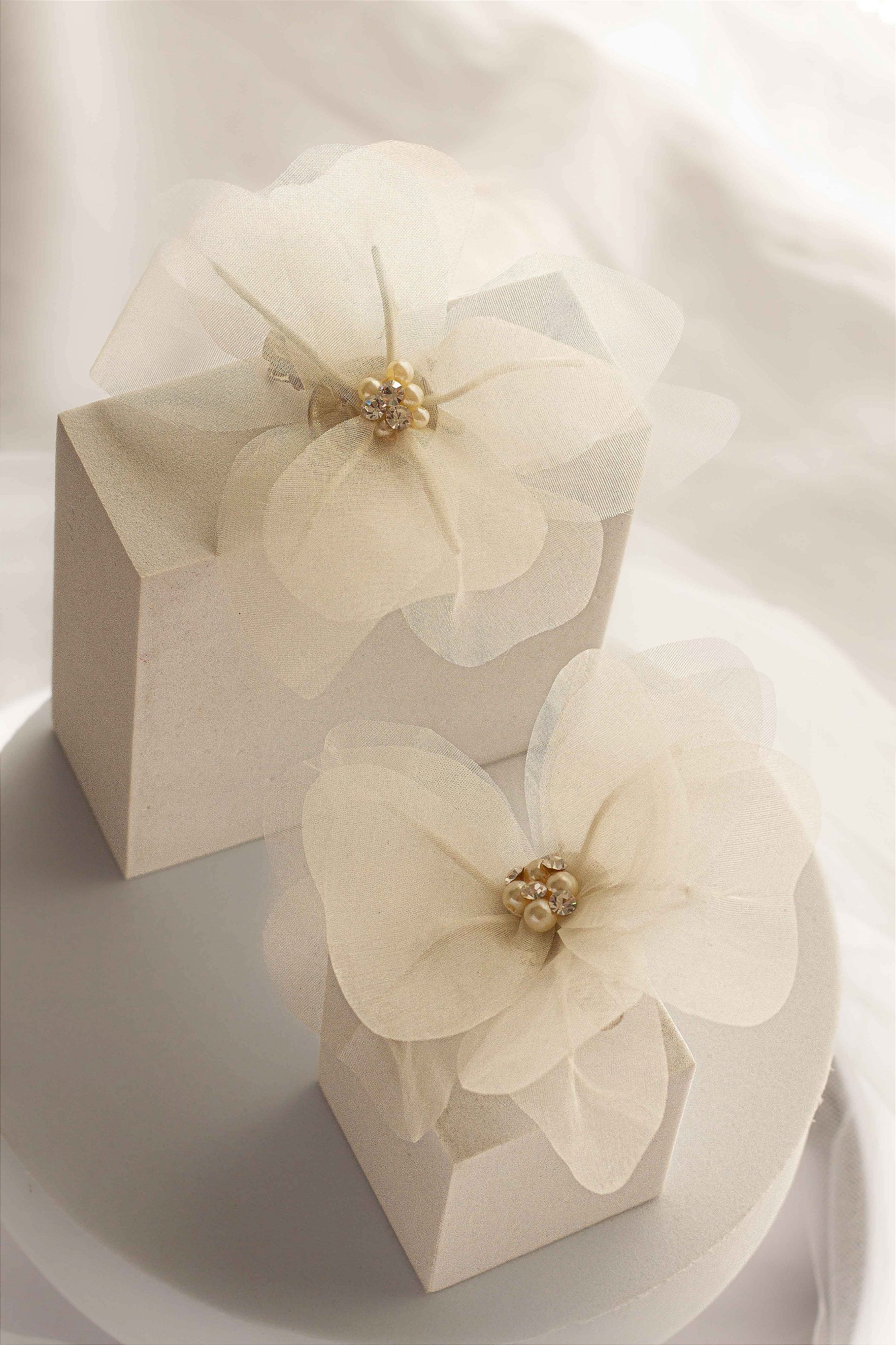 Inspirada na beleza escultural da orquídea, esta grinalda traduz em seda o que, na flor, já é pura delicadeza estruturada. Suas pétalas translúcidas, moldadas à mão, flutuam sobre o penteado como se repousassem ali por acaso — mas com a precisão de um traço artístico.