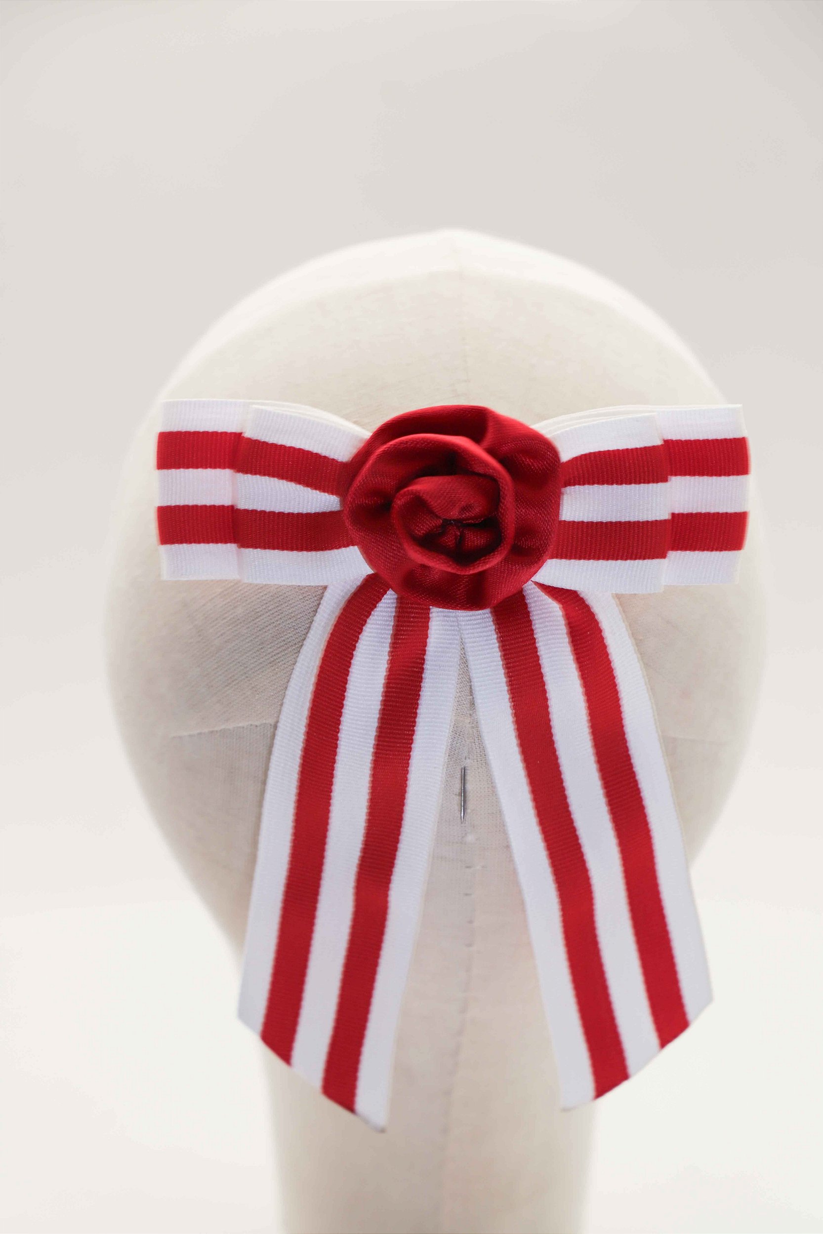O JC Laço Farol — Petit Lúmina (Listras Vermelhas) traz intensidade e energia na combinação das listras vermelhas e brancas, equilibradas pela flor central.