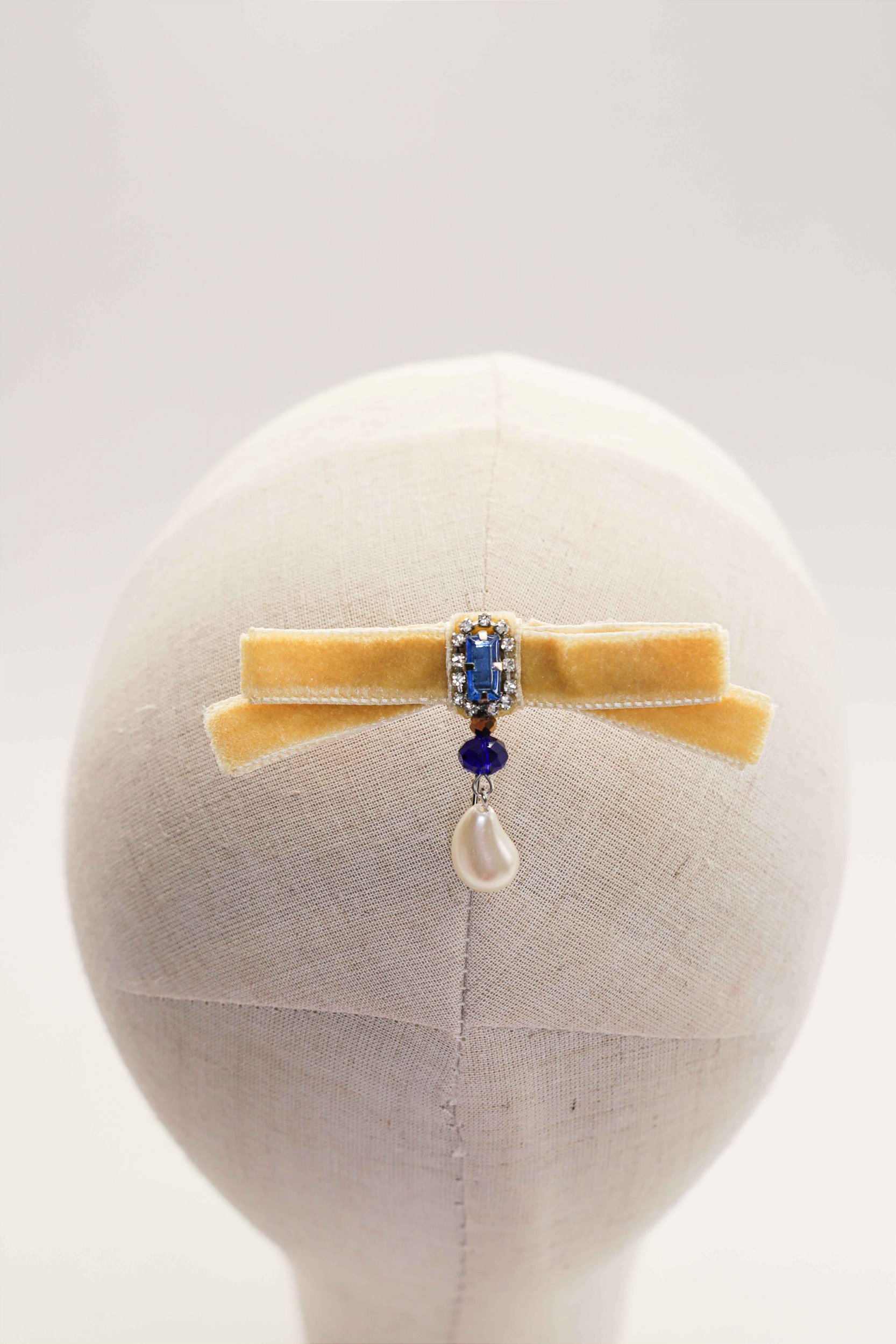 O JC Laço Pingo de Luz — Petit Lúmina (Amarelo Manteiga) revela a claridade suave do veludo em tom pastel, realçada pela aplicação de pedraria e pérola.