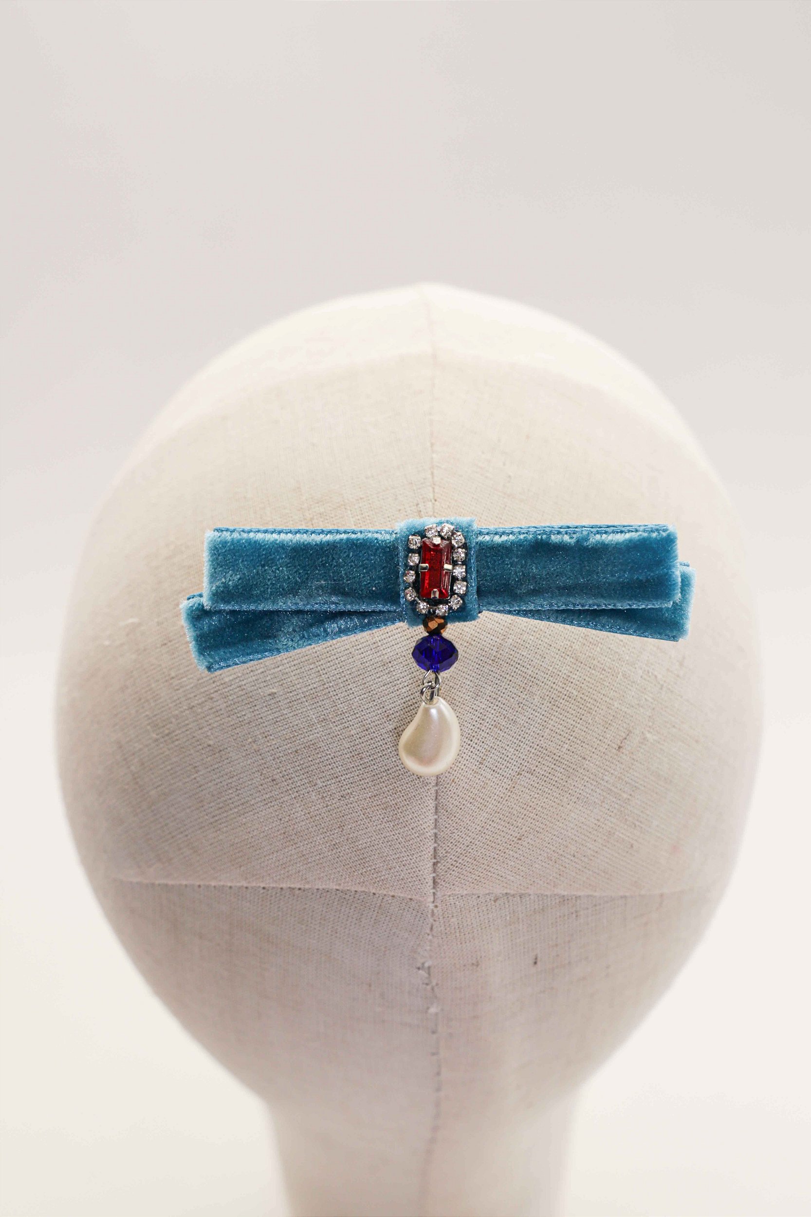 O JC Laço Pingo de Luz — Petit Lúmina (Azul Turquesa) combina a vivacidade da cor com a sofisticação da pedraria central e da pérola que repousa em movimento.