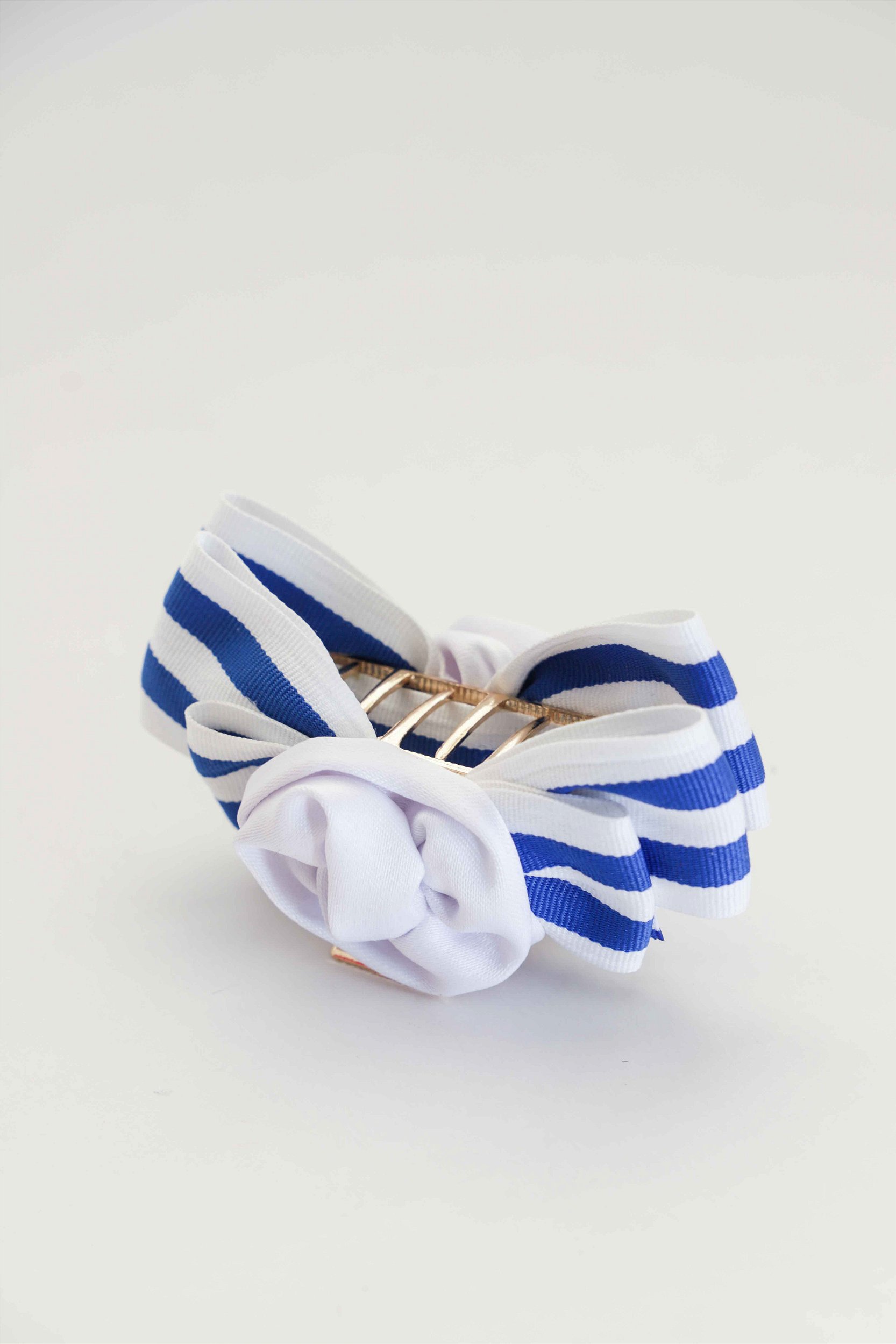 A JC Piranha Flor do Mar — Petit Lúmina (Listrada Azul) combina o grafismo das listras azul e branco com a delicadeza da flor branca central.