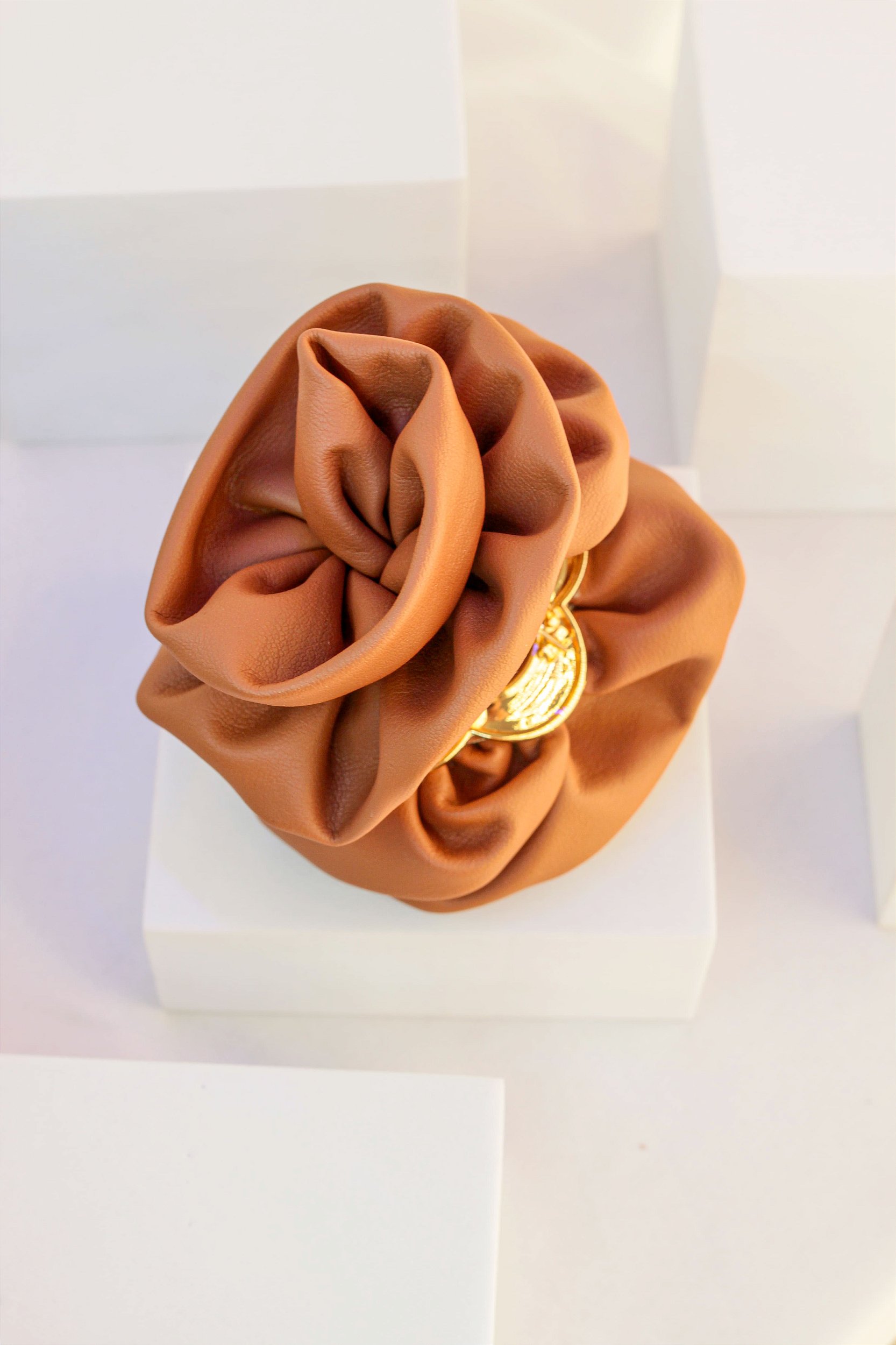 Entre as criações, destaca-se a JC Piranha Flor Priscila, uma fusão de arte e sofisticação. Feita com couro ecológico e flores esculpidas manualmente, essa peça única celebra o feito à mão com um design refinado. Sua base de metal dourado com banho adiciona um toque de elegância, tornando-a perfeita para quem valoriza acessórios exclusivos e sustentáveis.