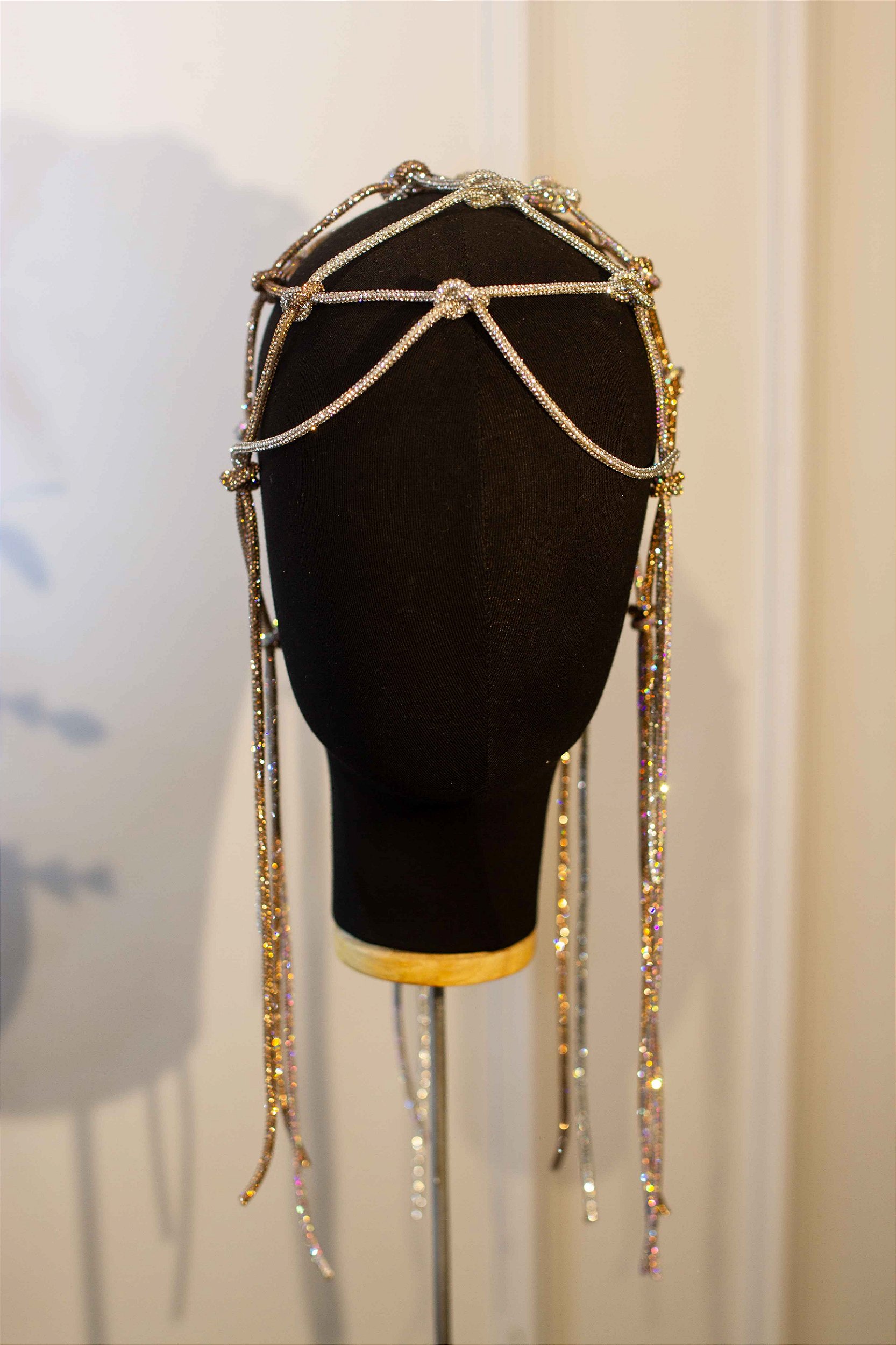 A JC Trama de Luz desenha a cabeça com uma rede de cristais e franjas alongadas, criando brilho contínuo e presença elegante. Leve e confortável, é uma peça de impacto sutil para quem entende o movimento como parte do espetáculo.